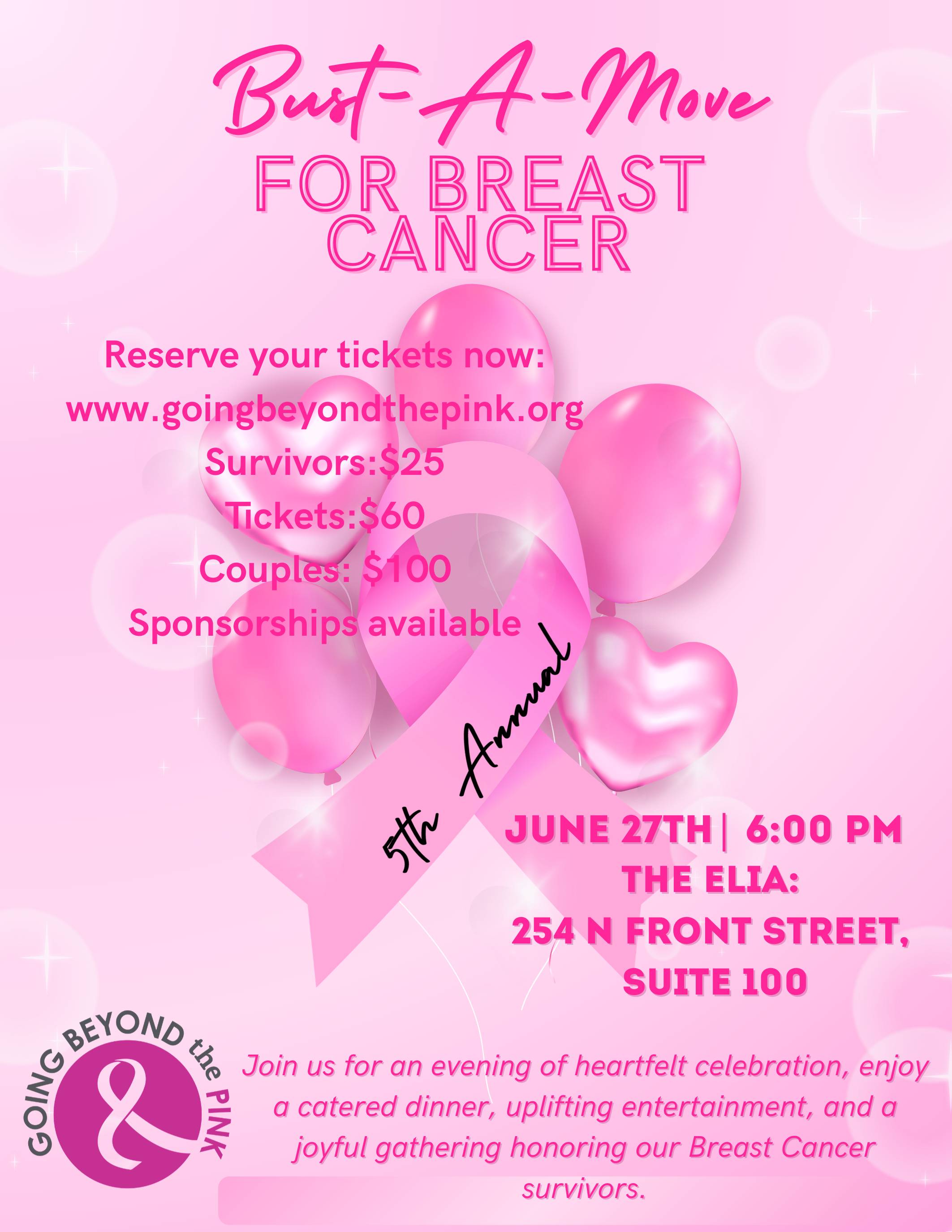 Get ready because the dance floor is about to come alive for a night that’s equal parts celebration and purpose. Going Beyond the Pink’s Bust-a-Move for Breast Cancer Dance Party (BAM) 2026 is back, and it’s bigger, bolder, and more meaningful than ever. Mark your calendars for Saturday, June 27th from 6:00–9:00 PM at The Elia located in Historic Wilmington, and prepare to dance the night away while supporting breast cancer patients and survivors right here in our community. From the moment the doors open at 6:00 PM, guests will enjoy a lively atmosphere filled with music, connection, and inspiration. DJ Miss Story will be spinning crowd-favorite hits, keeping the energy high from the first beat to the last. Guests will also enjoy a delicious catered dinner, heartfelt survivor spotlights, a silent auction packed with must-have items, and a 50/50 raffle that gives everyone a chance to give back—and win big. Whether you’re coming with friends, a partner, or flying solo, BAM is all about community. It’s a space where celebration meets compassion, where every dance step helps support critical services like patient navigation, education, and meaningful connection for those facing breast cancer.