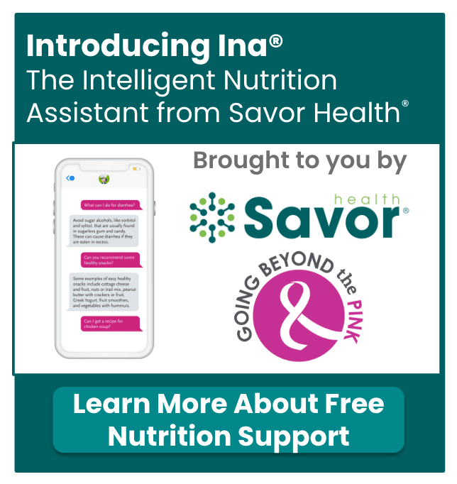 Going Beyond the Pink and Savor Health have partnered to share an amazing resource with you (psst... it's free!). Ina®, The Intelligent Nutrition Assistant provides personalized, evidence-based nutrition support 24/7 “on demand” to help cancer patients.