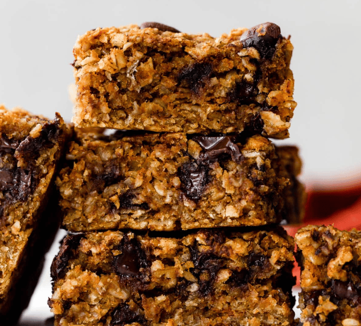 Spoon mixture into prepared pan. Using the back of a flat spatula or a spoon, spread and press it tightly down into the pan. Make sure it’s flat and very compact, which helps guarantee the bars hold their shape. Dot a few chocolate chips into the top—this is optional and only for looks!